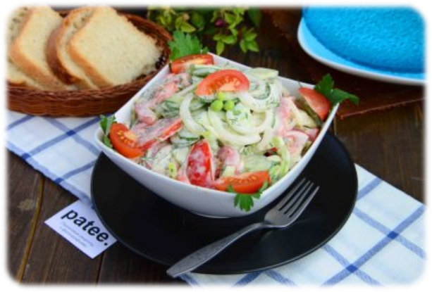 У спекотні дні літа салатів на нашому столику є поза конкурсом. Смачний і освіжаючий, вони дозволили нам залишитися в хорошій формі і відчувати себе. Легко літні салати дуже корисні як закуску. Красиво нарізані овочі змішані або просто розкладені на блюді, з невеликих продукти часто залишають їх недоторканими. Салати, які пропонують гарнір, приготовані зі смаком оригінальний продукт. Другі страви з м'яса, ви можете запропонувати салати, викликаючи апетит: з додаванням яблука, вишні, часник, цибуля, зелень. Рибні страви є салати м'які варені овочі (морквою, картоплею) з гострі приправи, перець та лимонний сік. Літні салати можна включати інші продукти в самих незвичайних комбінацій. Наприклад, літні салати, які служили в якості закуски, використовувати не тільки овочі, але також птиці, картопля, макаронні вироби, крупи. І салати, які пропонують як десерти, підготовлений з фруктів з додано соусів, приправ і солодкий кремів.Літній псує нам достаток різноманітних свіжих овочів та фруктів. Гарячий день змішані салат є чудовим варіантом для корисних закуски! Салат зроблено дуже швидко! Овочі досвідчений з великою кількістю майонезу. Салат подають з свіжий хліб, ж салат є прекрасним доповненням до різних Гарніри, м'яса, птиці та риби. Служити охолоджений салат. Інгредиенти: