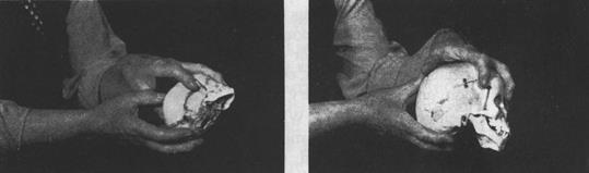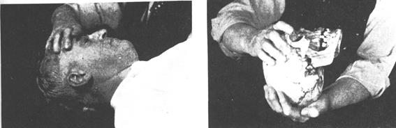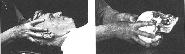 Рис. 11.9. Сфенобазилярная компрессия у детей. 3) При работе с одним ассистентом наиболее эффективна следующая методика: врач сзади держит затылок и височные кости обеими руками. Затем ассистент вводит сомкнутые указательный и средний пальцы под верхние зубы пациента. Большим пальцем этой руки обхватывает тыльную сторону другой руки, находящейся на лбу, таким образом, происходит комбинированный подъем лицевой части черепа и передней области свода. 4) Врач касается затылка немного дорзальнее лямбдовидных швов тенорами больших пальцев и, сцепив пальцы, осторожно, но достаточно сильно, сжимает вовнутрь для освобождения лямбдовидных швов и двигает затылочную кость кзади. В то же время ассистент таким же образом сжимает латеральные углы лобной кости и двигает ее вперед для отделения от венечных швов и снятия нагрузки с СБС. Врач производит действие на затылочную кость, затем двигает руки вперед, чтобы охватить сосцевидные отростки, удерживая их дорзомедиально, для ротации височных костей наружу и приведения СБС во флексию. Действуйте таким образом при особенно тяжелых случаях.
