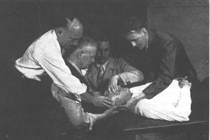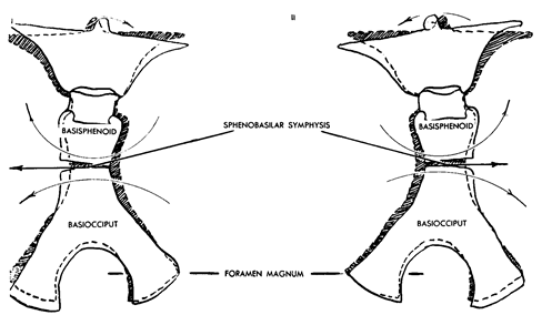 5) С помощью нескольких ассистентов врач держит затылочную кость или затылочную и височную кость, в то время как остальные ассистенты синхронно двигают остальные периферические кости до точки равновесия и удерживают, пока не наступит расслабление. Ж. Формирование. 1. Основная кость. При латерофлексии необходима физиологическая аккомодация между телом и соединением большого крыла с крыловидным отростком, чтобы позволить ему двигаться вниз со стороны выпуклости. В это же время вращение вокруг вертикальной оси заставляет тело основной кости и крыловидный отросток двигаться вперед, сужая нижнюю глазничную щель. Т.о. большое крыло должно оставаться в контакте с височной костью и т.о. стоять относительно дорзально. Такая аккомодация возможна благодаря упругости живой кости точно так же как и небольшой ротации большого крыла вокруг фронтальной оси. При большей степени аккомодации, особенно в течение первого года жизни, в лечение может быть включен метод формирования до получения более правильного контура и положения. 2. Затылочная кость. Напряжение в кости над латеральными синусами замедлить венозный дренаж и служить предупреждающим фактором, ведущим к нарушениям в ЦНС. Живая кость покажет их. При компрессии четвертого желудочка «трясущиеся пластины» затылка будут медиально сжаты. При такой технике формирования внешний кости будет сдавлен периферически. Формирование идет от inion до lambda, латерально к asterion и вниз к opistion. Пациент чувствует происходящие изменения. Дальнейшие формирующие процедуры, особенно применимые в детской практике, будут даны в главе XII. 3. Внутрикостные деформации. Это, главным образом, родовые повреждения из-за внутриматочного давления, неправильного применения хирургических щипцов других воздействий на организм новорожденных, которые могут вызвать деформацию предкостных элементов. Основная и затылочная кости особенно ранимы. Основная кость. В течение 8-ми месяцев внутриутробного развития она состоит из предсфеноидальной или передней части тела с малыми крыльями, и постсфеноидальной или задней части тела с соединением большое крыло – крыловидный отросток. Пред- и постсфеноидальные части сливаются за месяц или чуть больше до рождения, т.о. в этот сложный период основная кость состоит из трех частей: тело и малые крылья – одна часть, большие крылья и крыловидные отростки – две других части. При перинатальном формированием головы появляются следующие деформации. а) между решетчатой костью и предсфеноидальной частью (предсфеноидальная деформация). б) между пред- и постсфеноидальной частью всевозможные деформации в СБС. Такое повреждение может быть так же результатом чрезмерного давления через лобную часть и малые крылья на предсфеноидальную часть, либо через лобные кости, теменные, скуловые, височные кости, затылочную на постсфеноидальную. А также при натяжении мембраны. Латеральное растяжение или перемещение может быть вызвано ротацией происходящей во время прохождения головы плода через таз матери; вертикальное растяжение, когда затылок проходит под лонной дугой. Оба сопровождаются компенсаторными изменениями периферических структур. Так называемые монголоидные глазницы, вероятно, являются результатом изменения отношений между большими и малыми крыльями (см. гл. XIII).