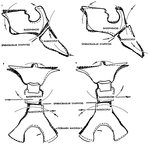 Рис. 11.7. Диаграмма патобиомеханики СВС. I. Вертикальное растяжение. Вид сбоку. Базилярный отросток основной кости перемещается в краниальном направлении (флексия), а базилярный отросток затылочной кости - каудально (экстензия) или наоборот. Обе кости вращаются вокруг параллельных фронтальных осей в одном направлении. Повреждение названо по положению базилярного отростка основной кости - вертикальное краниальное растяжение или перемещение и т.д. П. Латеральное растяжение. Вид сверху. При растяжении или смещении базилярный отросток основной кости двигается в одну сторону, а затылочный в другую. Обе кости вращаются вокруг параллельных вертикальных осей в одном направлении. Травма называется по положению базилярного отростка основной кости - правостороннее латеральное растяжение и т.д.