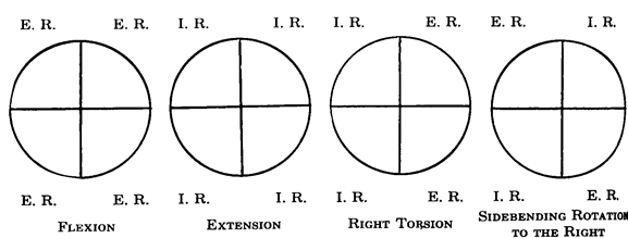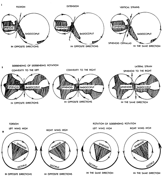 Рис. 11.13. Диаграмма обобщения повреждений СБС. I. Вид сбоку. Вращение вокруг параллельных фронтальных осей. В противоположных направлениях: флексия и экстензия. В одном направлении: вертикальное растяжение с поднятием (опущением) основной кости. II. Вид сверху. Вращение вокруг параллельных вертикальных осей. В противоположных направлениях: ротация + латерофлексия. В одном направлении: латеральное растяжение, основная кость – вправо или влево. III. Вид сзади и спереди. вращение вокруг сагиттальной оси. В противоположных направлениях: торзия с подъемом левого крыла или правого. В одном направлении: ротация латерофлексии, левое или правое, и смягчить мембранное натяжение.