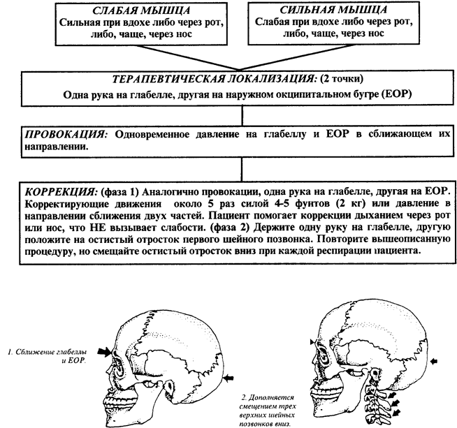 По утверждению Апледжера затылочная кость чаще ответственна за дисфункцию краниосакральной системы. Затылочная кость служит местом прикрепления многих мышц, которые приходят в состояние напряжения и сокращения вследствие стрессов повседневной жизни. "Влияние окципитальной иммобильности на систему твердой мозговой оболочки огромно. Затылочная кость обеспечивает прочное прикрепление задних границ нижних аспектов серпа мозжечка. Через эти уникальные прикрепления мозговой оболочки затылочная кость может оказывать существенное влияние на прямой венозный синус, поперечные венозные синусы, взаимодействие синусов, задний сагиттальный синус и окципитальный синус. Таким образом, дисфункция затылочной кости может приводить к нарушению функции венозного синуса. Застой жидкости в системе венозных синусов оказывает влияние на систему реадсорбции спинномозговой жидкости (arachnoid villae), расположенную, в основном, в сагиттальном синусе. В пределах прямого синуса располагается маленькое тело, напоминающее арахноидальную зернистость, которое тоже испытывает влияние функции затылочной кости. Это тело проецируется на основание прямого синуса около соединения с большой мозговой веной. Оно содержит синусоидальное сплетение кровеносных сосудов, которые действуют как контрольный механизм шарикового клапана при наполненности кровью. При этих обстоятельствах осуществляется значительный контроль за оттоком по большой мозговой вене, что в свою очередь, влияет на адсорбцию CSF в венозную систему. Крайне прочное прикрепление твердой мозговой оболочки к большому отверстию является еще одним фактором, требующим внимания. Дисфункция затылочной кости как результат гипертонуса мышц должна влиять на функцию аккомодации и подвижность спинномозговой дуральной трубки. Обратите также внимание, что твердая мозговая оболочка прочно прикреплена к задней поверхности второго и третьего шейных позвонков..." (Апледжер, стр.204) Затылочная кость сочленяется с 6 (иногда 7) костями и играет главную роль в мобилизации височных и теменных костей. Она сочленяется с: а. Теменными костями (2) b. Височными костями (2) с. Клиновидной костью d. Атлантом (1 шейным позвонком) с. Вторым шейным позвонком (как исключение, мыщелок образует синдесмоз с зубовидным отростком.) Коррекция повреждений, вовлекающих цервикальные и шовные сочленения, обсуждалась ранее, и не нуждается в повторении. Межкостные повреждения затылочной кости имеют большое значение и требуют дальнейшего изучения. При рождении затылочная кость состоит из четырех хорошо различимых частей, соединенных хрящем: основания, роговой чешуйчатой тонкой пластинки и двух латеральных масс или мыщелковых частей. Эти пластинчатые и хрящевые компоненты заключены в плотную оболочку из внешнего надкостничного и внутреннего дурального слоев, которая является единственным средством сохранения их правильного положения в этот критический период, поскольку их внутрикостные соединения далеки от стабильности. Хрящевые соединения подвержены сублюксациям и становятся этиологическими факторами нарушений на уровне центральной нервной системы. "Вплоть до возраста пяти-шести лет в черепе не существует иных "механических приспособлений" кроме АТЛАНТО-МЫЩЕЛКОВОГО, которое играет основную роль в создании патологии." (M
