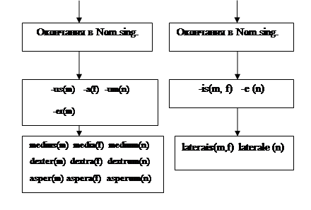 Большая часть прилагательных II группы - это прилагательные с двумя окончаниями. Словарная форма этих прилагательных также указывается в Nom.sing. и включает 2 компонента: одинаковую форму для мужского и женского рода с окончанием -is и окончание среднего рода –e brevis, e (основа: brev-) frontalis, e (основа: frontal-).