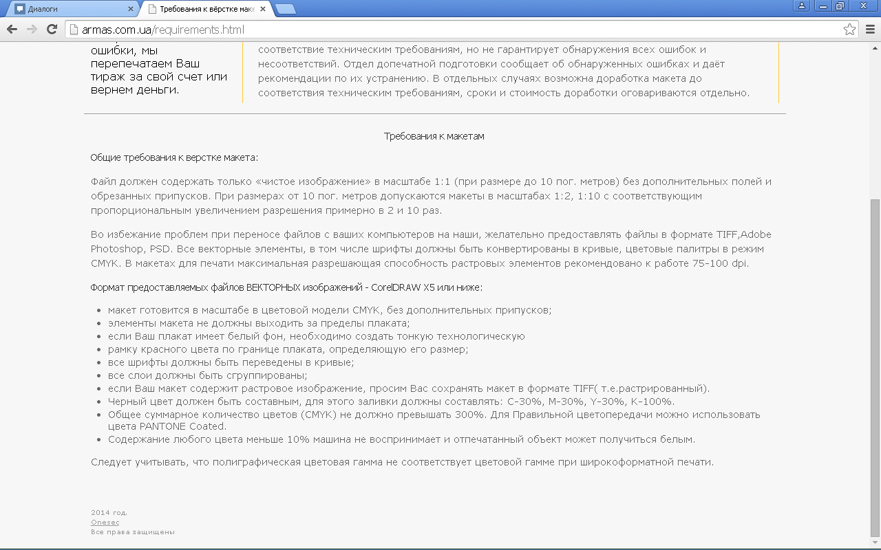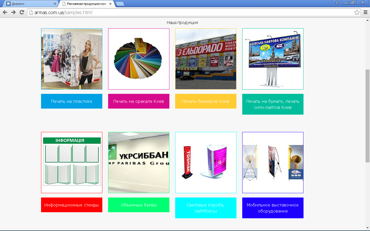 1. Очень жаль, что за некрасивой картинкой (я про сайт в целом) ускользает большая прогрессивная полиграфическая компания. О таких клиентах как у Вас надо КРИЧАТЬ (укрсиббанк, эльдорадо). А не прятать на второй вкладке (до которой не факт, что клиент дойдет). 2. Цвета и подача выбраны, мягко говоря неудачные.