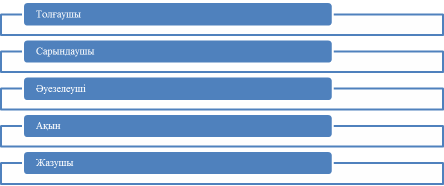 Авторды толғаушы дегенде: «Толғаушы ақын әуелі көңілінің күйін, мұңын, мүддесін, зарын, күйінішін, сүйінішін айтып, шер тарқату үшін толғайды, екінші ішкергі ғаламында болған халдарды, нәрселерді тысқа шығарып, басқаларды сол көңілінің күйіне түсіріп, халін түсіндіру мақсатпен толғайды», - деген [8,450 б.]. Әуезелеуші деген - автордың әңгіме, тарихи әңгіме, т.б. шығармалардағы рөлі, толғаушы деген - лирикалық өлеңдердегі ақынның рөлі. Ал сарындаушы дегенде: «Сарындаушы – өз заманындағы бар тұрмысты ғана суреттеп қоймайды, өнеге үшін жоқ тұрмысты да алып суреттейді» [8,450 б.]. А.Байтұрсынұлының жіктемесі бойынша Т.Әбдікұлы әуезелеуші және сарындаушы ретінде танылды. Сурет 2. В.Е.Хализев жіктемесі