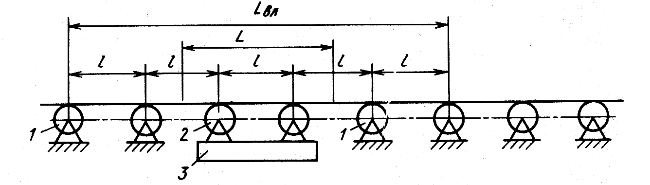 1.2 Ертеден келе жатқан конвейерлі таразыларды сараптау Үздіксіз өлшеу мәселесін шешу металлургиялық, химиялық және құрылыс өндірістеріндегі көптеген технологиялық процестеріне қажет. Бұл мәселе, әдетте, негізін конвейерлі өлшеу құрылғылары құрайтын таспалы өлшеу құрылғыларын қолдану арқылы шешеді. Әрекет ету принципі жағынан конвейерлі таразылар гравитациялық және радиоизотопты болып бөлінеді. Жүк салмағын қосу тәсіліне қарай конвейерлі таразылар жинақтаушы және интералдаушы болып бөлінеді. Конвейерлі жинақтаушы таразыларда есептегіш құралдар таспаның белгілі бір ара-қашықтыққа жылжуына сәйкес келетін бірінің соңынан бірі келетін жүктердің салмағын қосуды жүргізеді. Интегралдаушы таразыларда есептегіш құралдар таспаның жылдамдығын ескере отырып уақыт бойынша өн бойы салмақты интегралдайды. Таразының жүкті қабылдау қызметін конвейердің бір бөлігі немесе бүтіндей конвейер болады. Қосылған салмақты өлшеу және қателіктердің жинақталуына «өлшеу учаскесі» L мен «ықпал ету учаскесі» Lые. елеулі әсер етеді. Өлшеу учаскесі L деп өлшеуіш платформаның шеткі роликтерінің ара-қашықтығы мен осы роликтермен конвейердің жақын арадағы қозғалмайтын тірек ара-қашықтығының жарты қосындысына тең шаманы айтады (1.4 сурет). «Әсер ету учаскесі» өлшеу учаскесі мен қозғалмайтын ролик тіректерінің ара-қашықтығының 4-6 еселенген шамасы қосындысына тең. Жоғарыда қарастырылған тәсілдерді ескере келіп, үздіксіз жұмыс ітейтін интегралдаушы механизмдердің қосушы жұмысы келесі өрнектермен сипатталады: