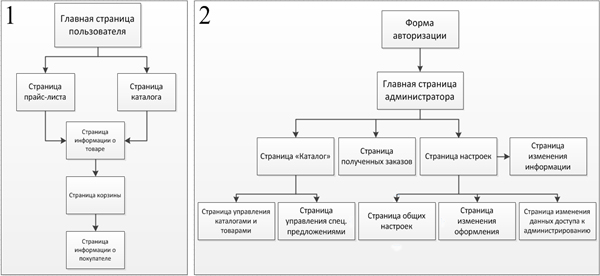 Форма авторизации – в ней администратор вводит логин и пароль для попадания на страницу администрирования сайта; На главной странице администратора находится общая информация о магазине – количество полученных заказов за промежутки времени (сегодня, вчера, в этом месяце и всего), а также информация о продуктах (общее количество продуктов, сколько из них продаются, количество категорий продуктов). С главной страницы можно попасть на страницу «Каталог», страницу полученных заказов и на страницу настроек; Страница «Каталог» - делится на: Страница Категории и товары - позволяет администратору создавать/редактировать/удалять категории и товары; Страница Специальные предложения – на ней отображаются товары, которые администратор перенес, присвоив им статус спец. предложения, которые можно отсортировать, по номеру, для порядкового отображения на главной странице или же удалить ненужное предложение. Страница полученных заказов – содержит записи в таблице, о данных введенных покупателем во время оформления заказа и позволяет администратору удалить выбранный заказ кликом на соответствующую кнопку. Страница настроек делится на: Страница общих настроек – позволяет администратору редактировать информацию о названии магазина, urlмагазина, контактный email адрес магазина, еmail, на который будут отправляться уведомления о заказах, а также информацию о валюте действующей в интернет магазине – обозначению (например $), и код валюты (например USD). Страница изменения оформления – позволяет администратору редактировать настройки каталога – максимальное количество товаров на странице, максимальное количество столбцов при показе товара, цвета использующиеся при оформлении таблиц. Страница изменения данных доступа к режиму администрирования – позволяет изменить логин и пароль администратора на новый. Страница изменения информации - позволяет администратору редактировать информацию о магазине (любую информацию для пользователей магазина) и информацию о доставке и оплате.