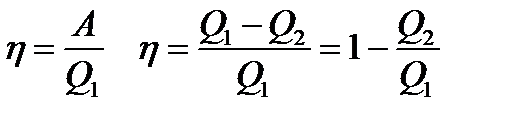 Для возвращения рабочего тела в исходное состояние необходимо сжать газ, т.е. совершить работу А2 над газом. Чтобы эта работа была меньше той, которую при расширении совершил газ, необходимо газ охладить, т.е. передать часть энергии Q2 холодильнику. Рабочему телу передаётся в результате теплообмена количество теплоты Q1 и совершается над ним работа А2. Рабочее тело, расширяясь, совершает работу А1 и передаёт количество теплоты Q2 холодильнику. На основании первого начала термодинамики, можно записать Q1+А2=Q2+А1. Следовательно, полезная работа теплового двигателя А=А1-А2=Q1-Q2.