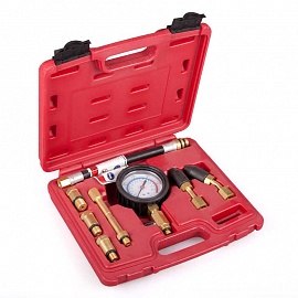 Универсальный бензиновый компрессометр специально разработан и изготовлен для замера давления в цилиндрах двигателей как cо стандартным расположением свечей зажигания, так и в бензиновых двигателях с труднодоступными свечами. Манометр заключен в резиновый чехол и оснащен боковым клапаном для быстрого сброса давления. В набор входят различные переходники для подключения прибора к различным модификациям двигателей как автомобилей, так и мотоциклов (резиновые штуцера и штуцера с различной резьбовой частью).