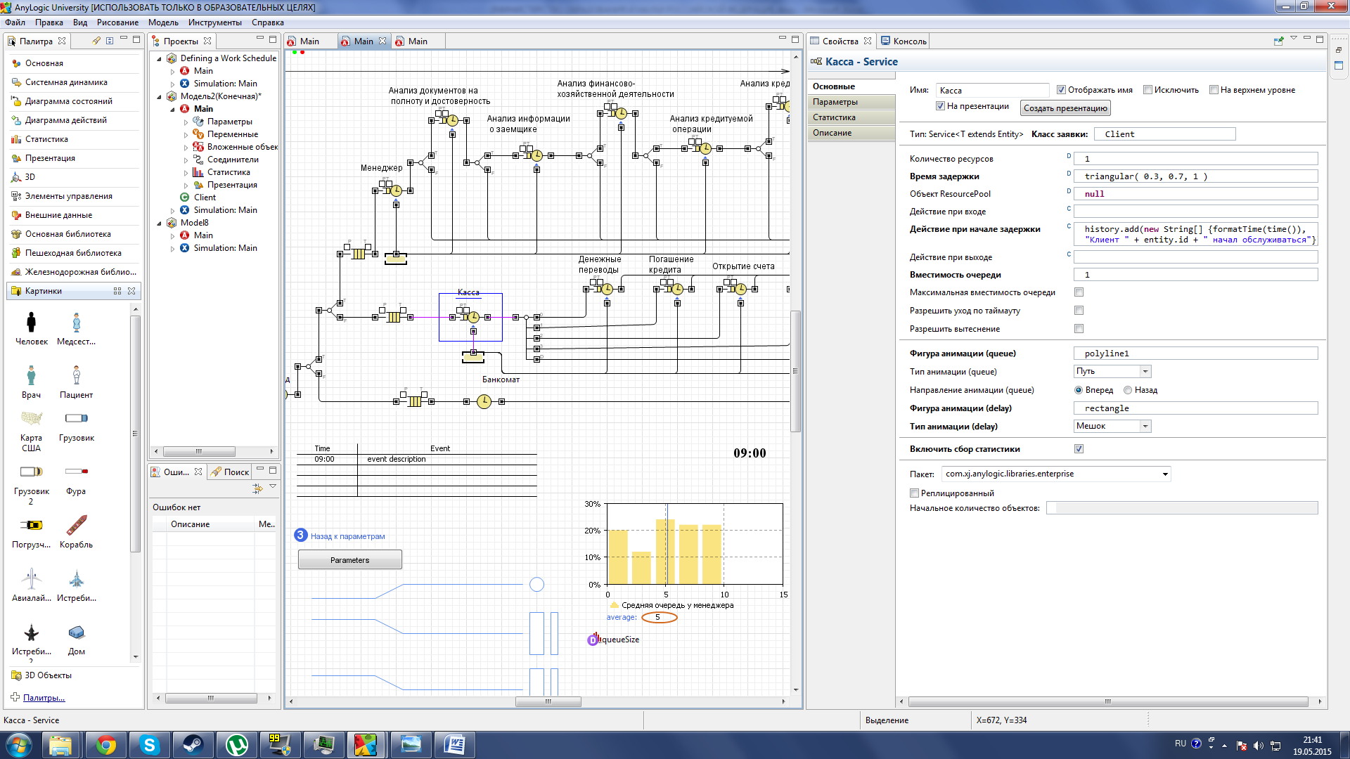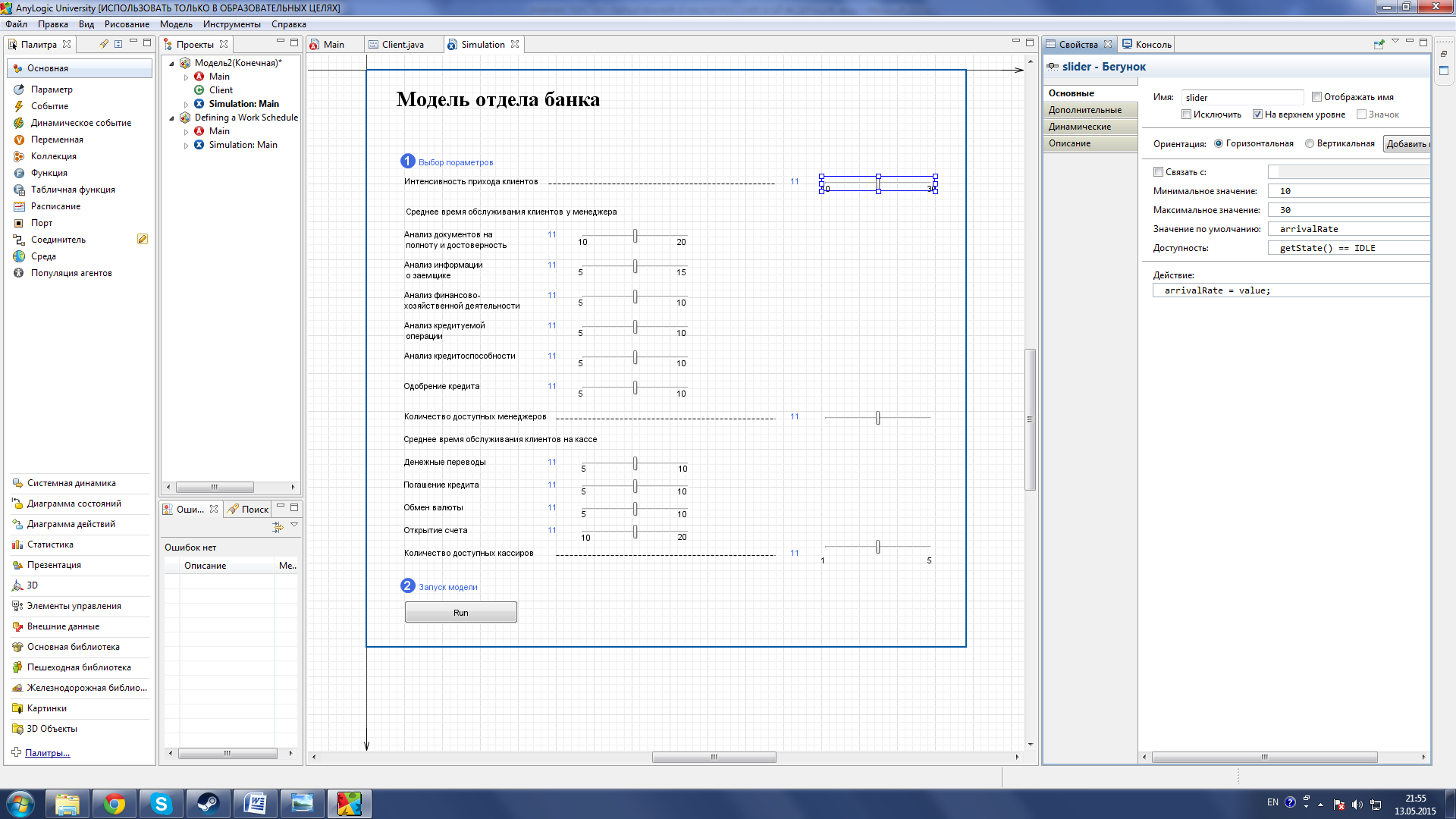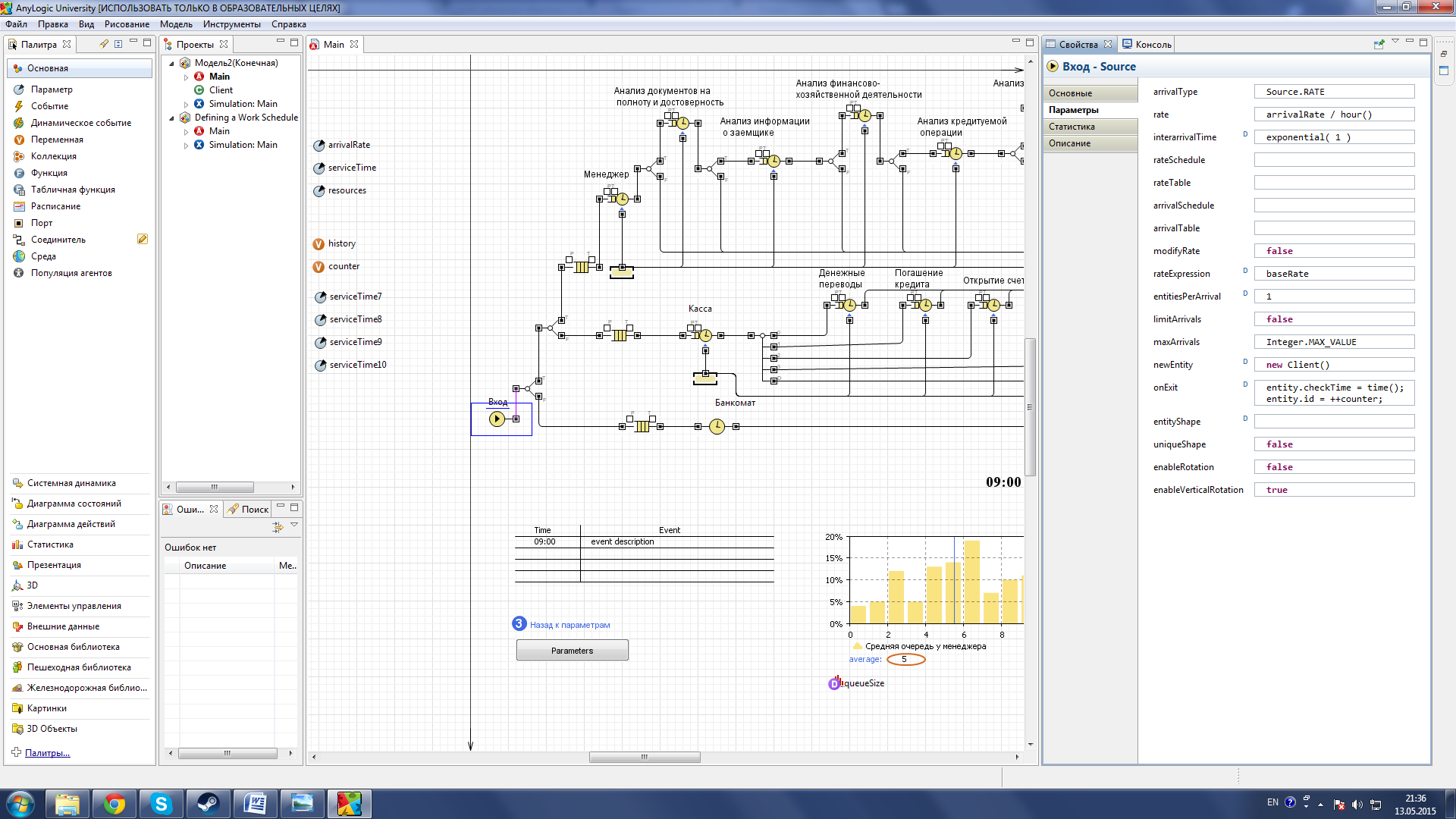 Рисунок 32 –Применение параметра serviceTime Параметры arrivalRate использовался для Регулировки интенсивности прибытия клиентов банка (см. рис. 33).