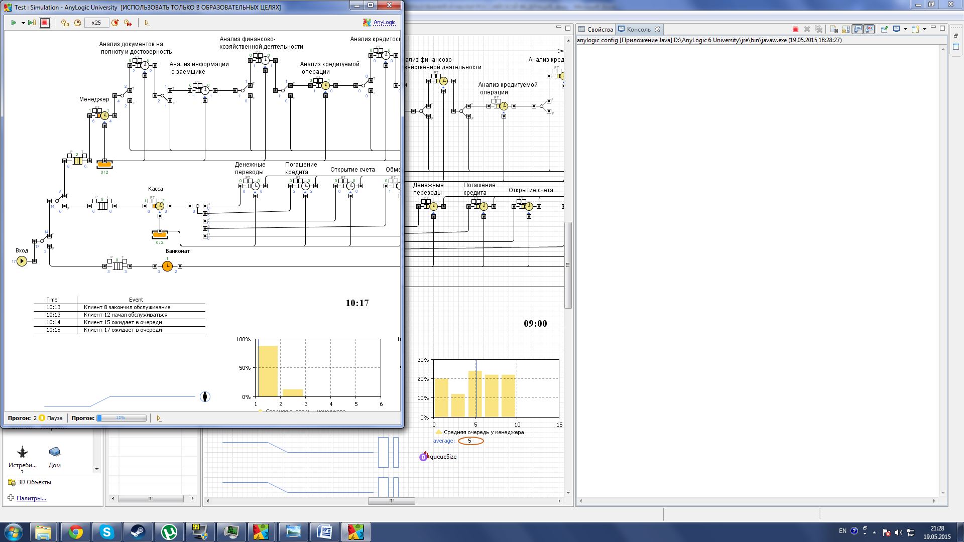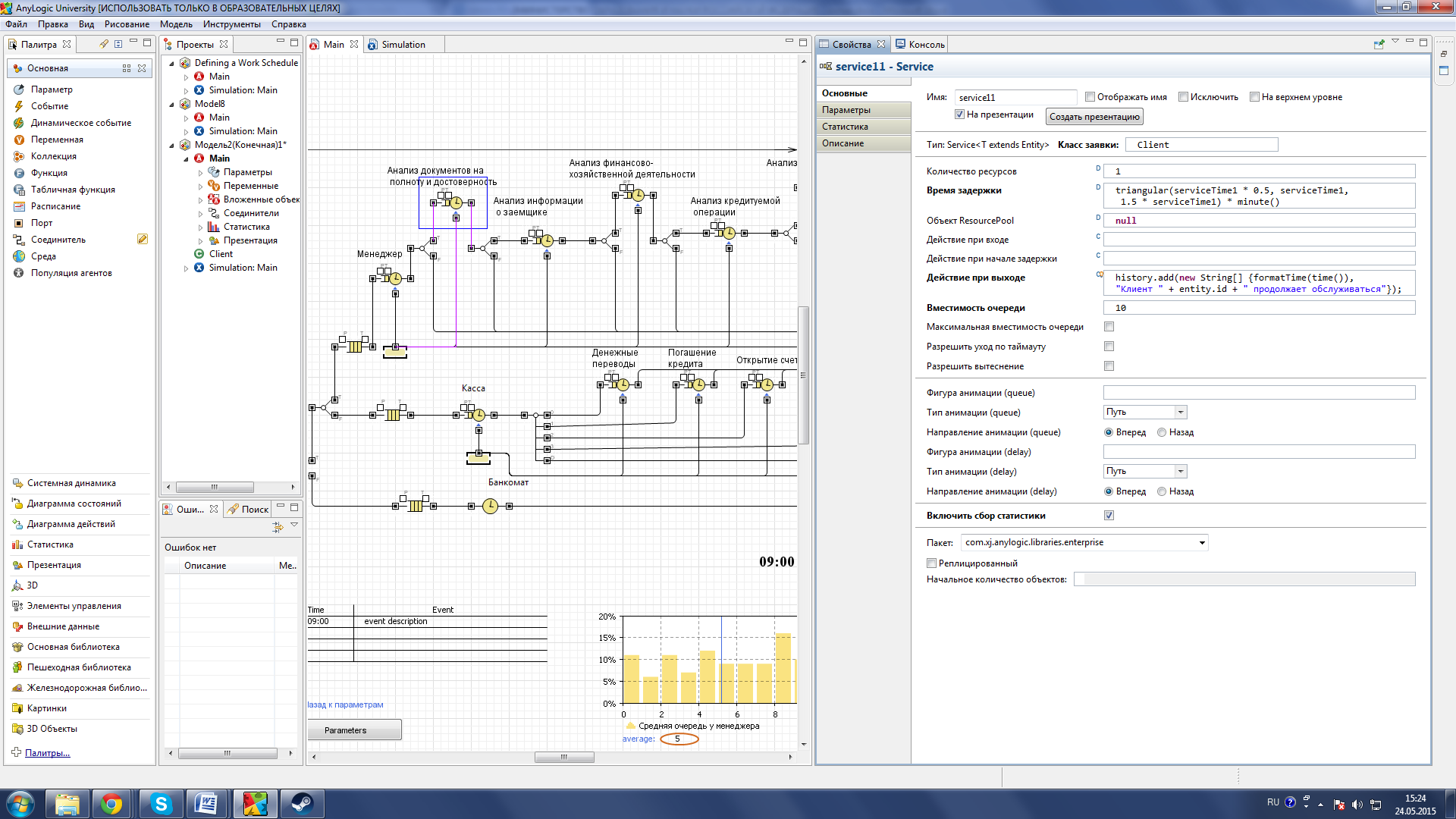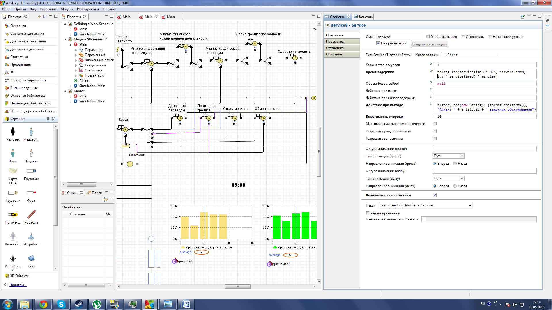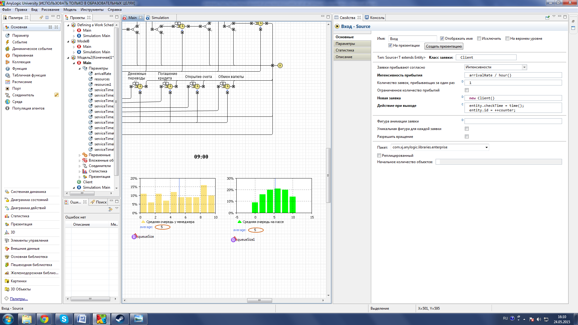 Рисунок 32 –Применение параметра serviceTime Параметры arrivalRate использовался для Регулировки интенсивности прибытия клиентов банка (см. рис. 33).