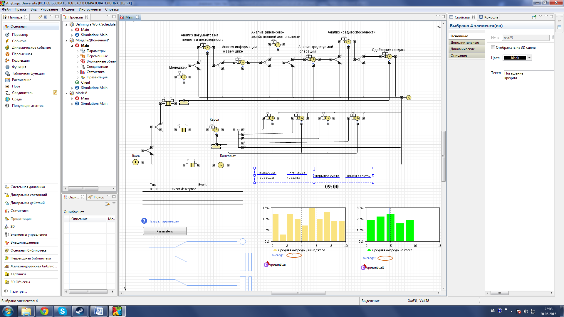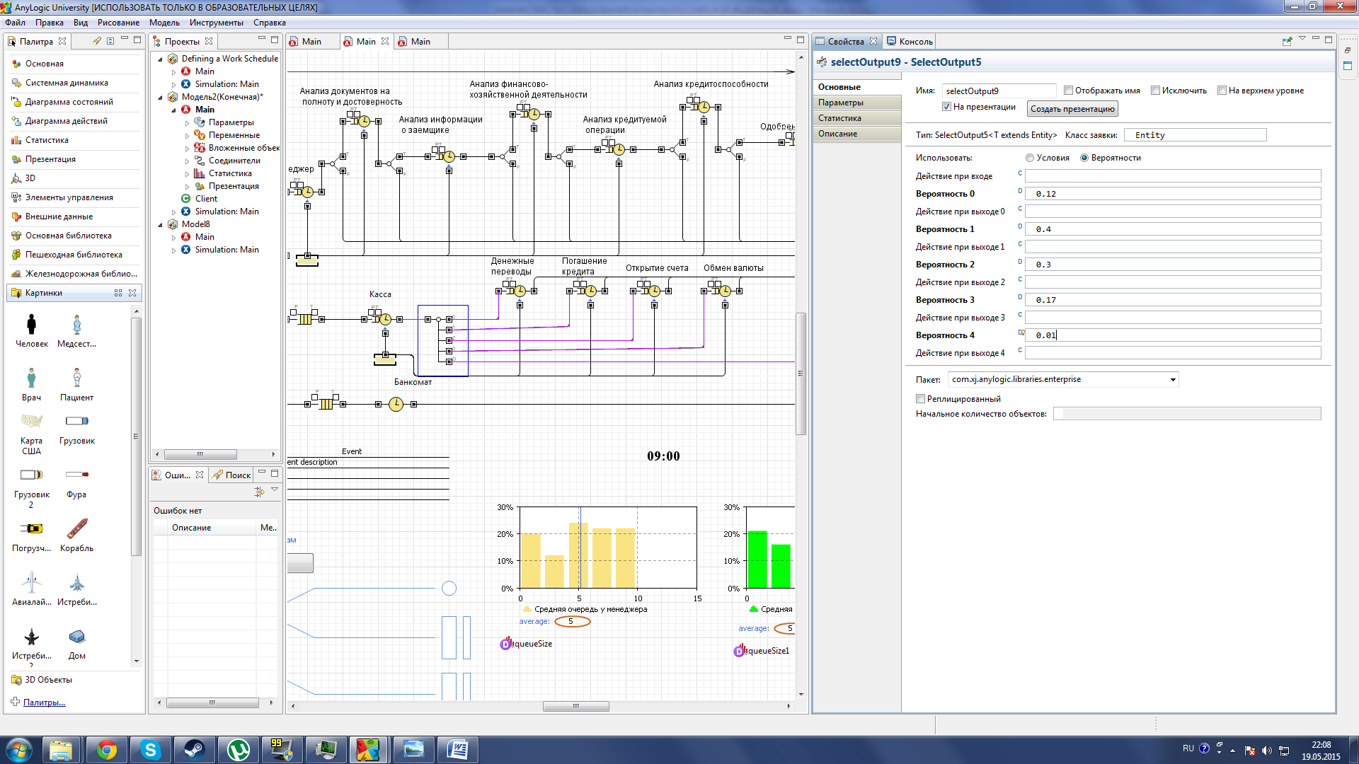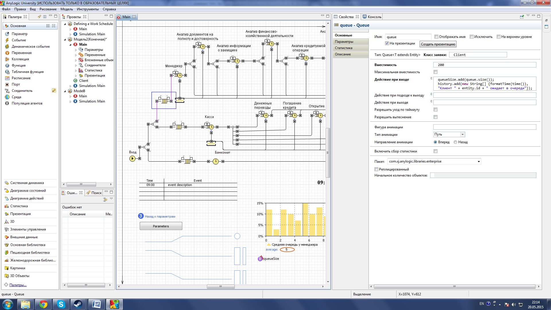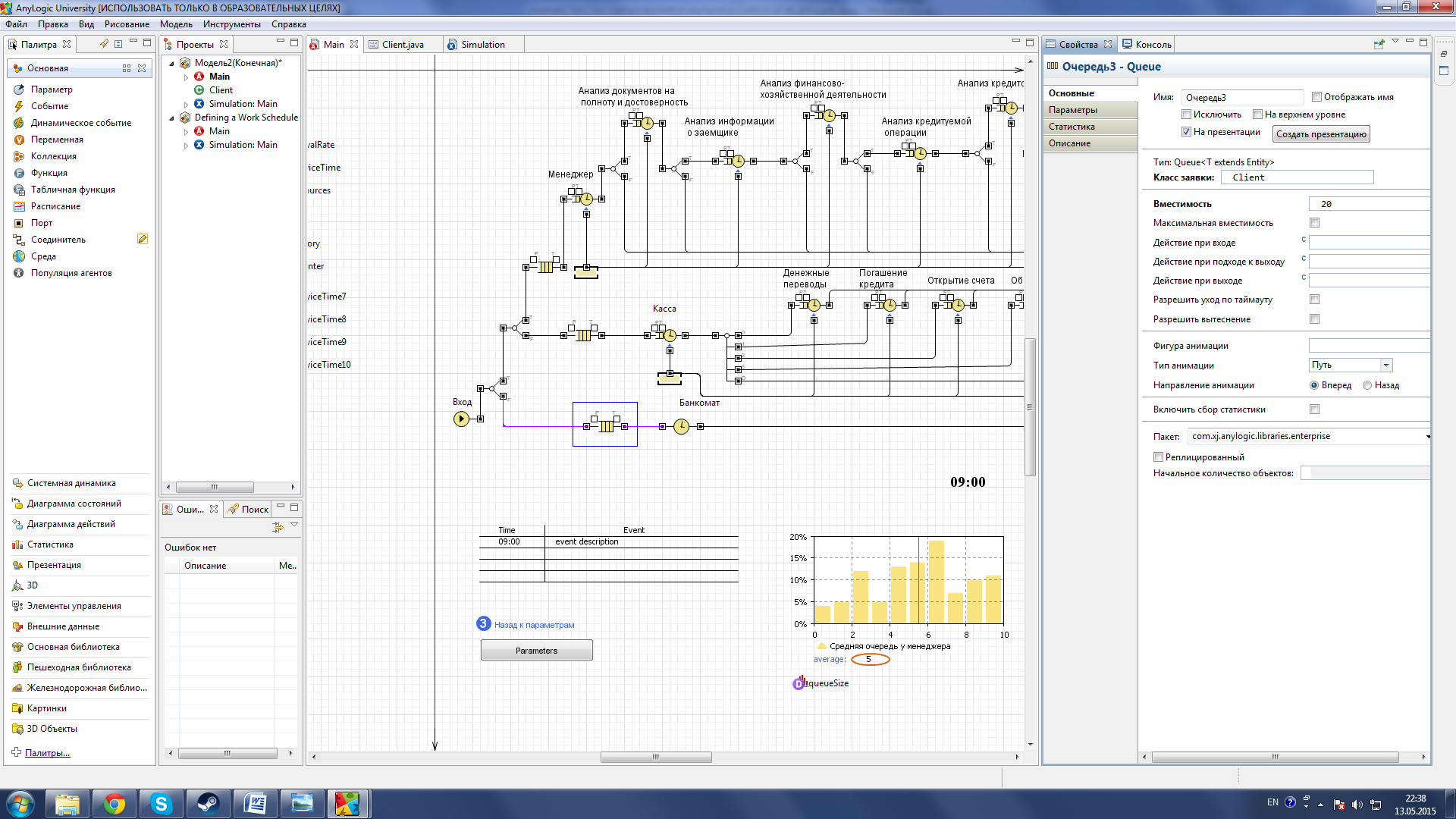 Рисунок 27 – Параметры Queue Когда подойдет очередь клиента, он начинает проходить стадии проверки его кредитоспособности, исходя из полученных данных, на каждой стадии есть своя вероятность отказа в кредите. Анализ документов на полноту и достоверность 30%, анализ информации о заемщике 25%, Анализ финансово-хозяйственной деятельности 20%, анализ кредитуемой операции 15%, анализ кредитоспособности 10%, одобрение кредита 10%. Все стадии так же можно регулировать по времени затрачиваемого на их прохождение. Их модели построены на подобии друг друга поэтому все их рассматривать нет смысла, далее будет рассмотрена модель анализа документов полноту и достоверность (см. рис. 28).