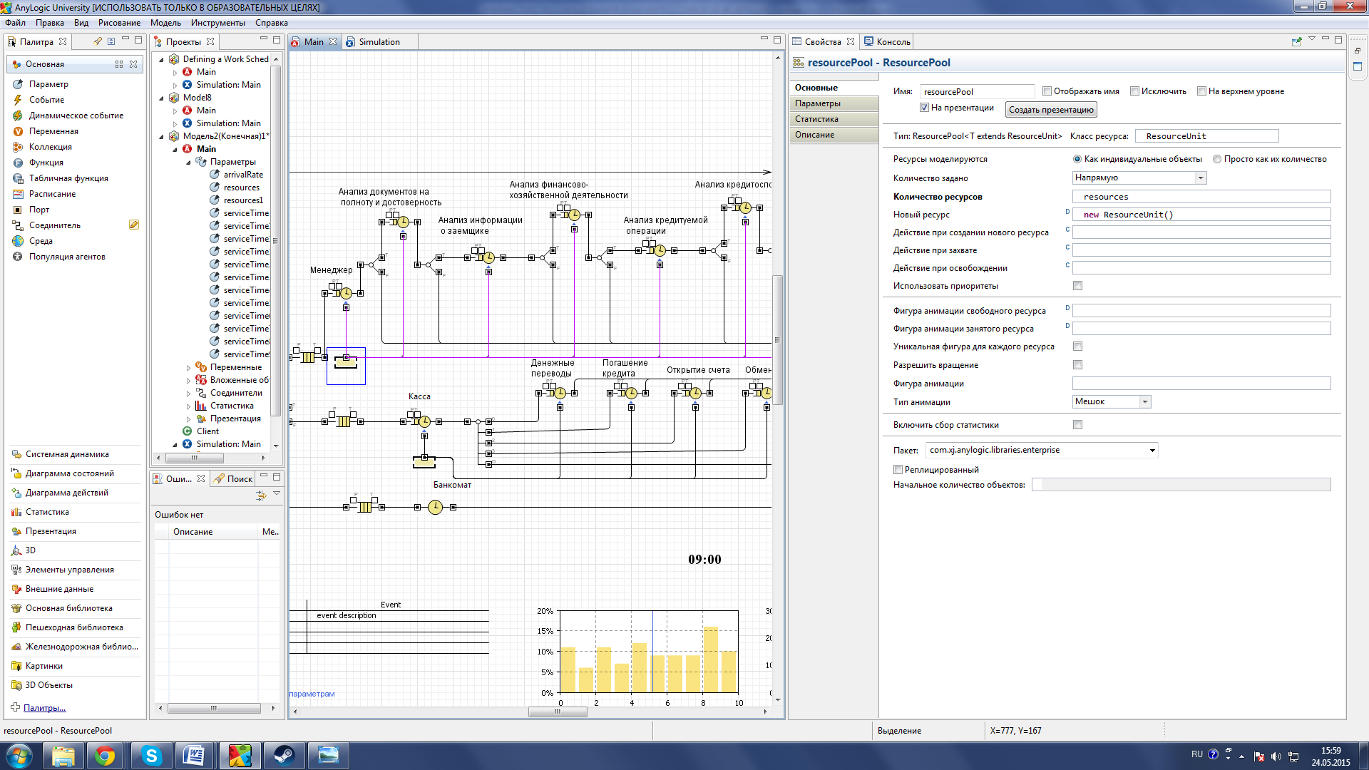 Рисунок 34 –Применение параметра resources Также мной были введены две диаграммы для сбора данных и статистики, основываясь на данных полученных из нее можно регулировать модель до получения наилучших результатов (см. рис.35).