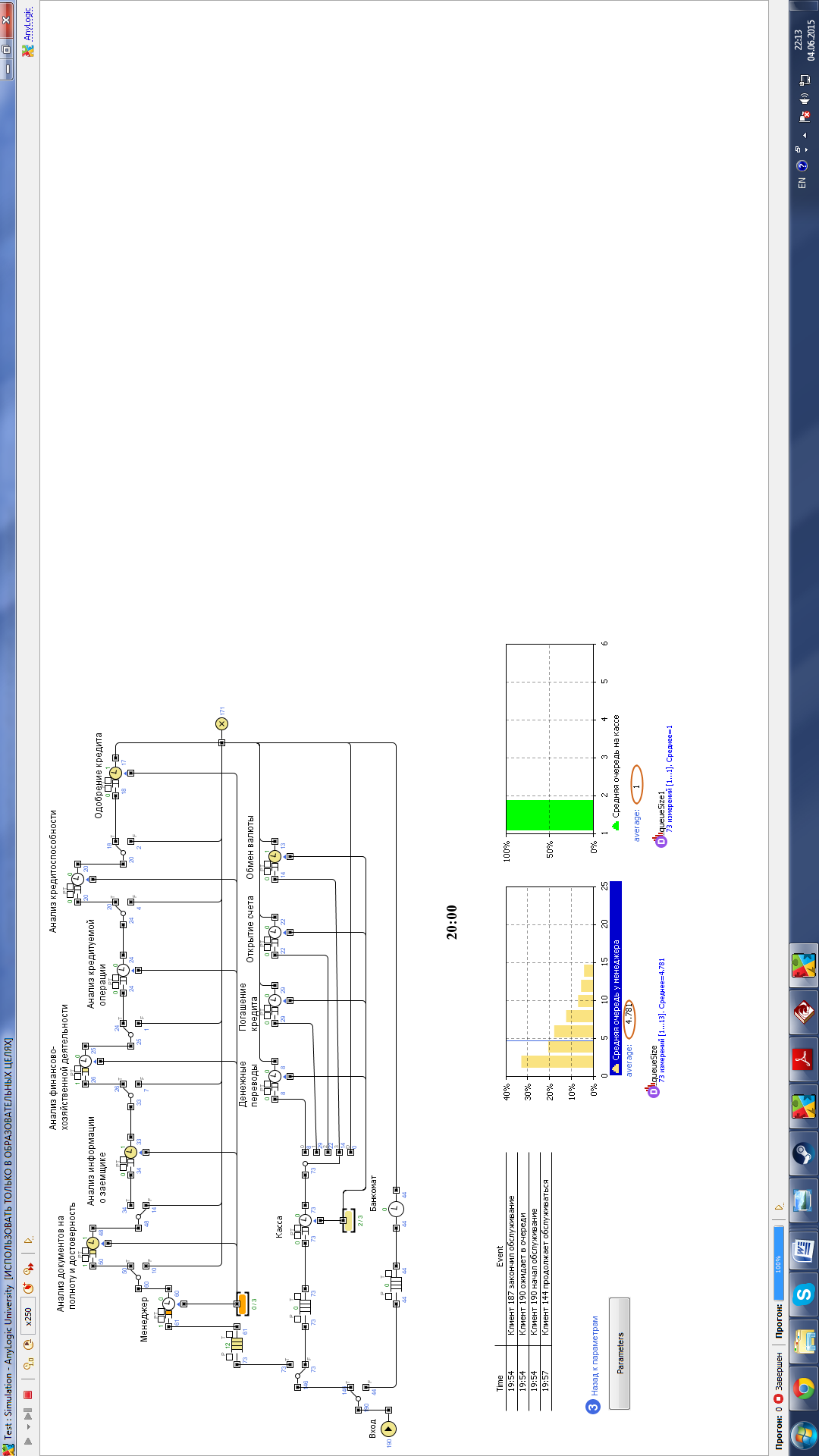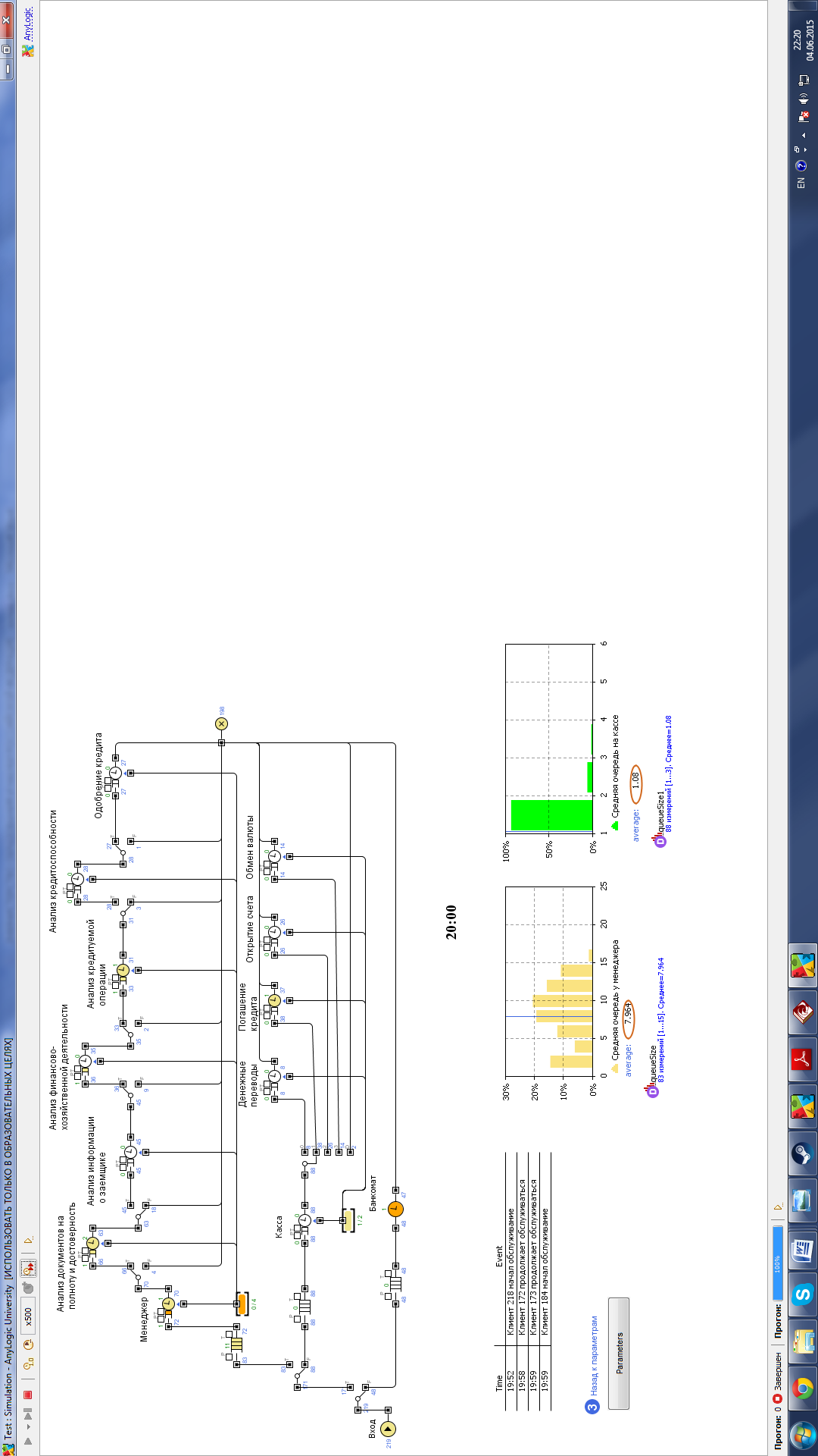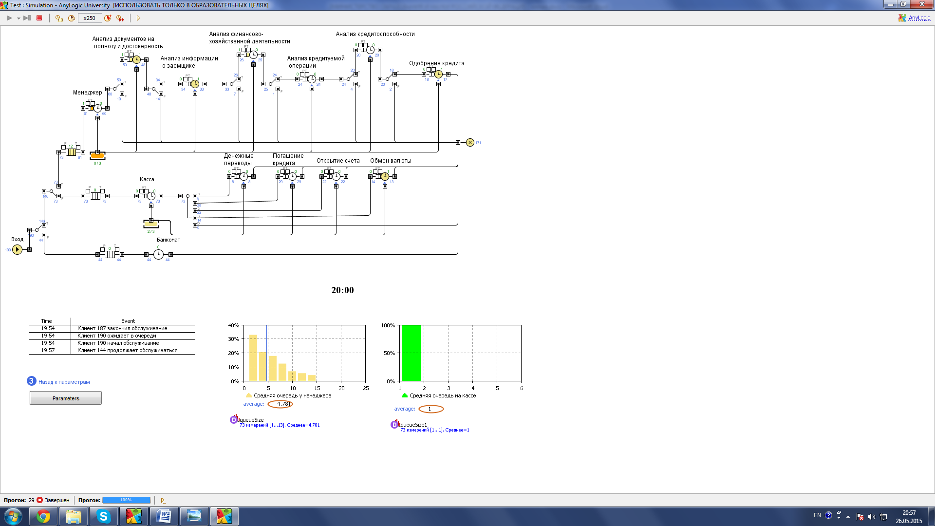Из полученных результатов видно, что очередь у менеджеров существенно сократилась, также сократилось и время ожидания в очереди теперь почти для всех случаев оно составляет не более 3 минут. Внешне ситуация на кассах почти не изменилась с учетом того что количество работников было уменьшено. Так же одним весьма важным элементом является то что в связи с уменьшением нагрузки и уменьшение времени обслуживания, количество обслуженных клиентов банка увеличилось. На рисунке 39 видно что раньше банк успевал обслуживать в среднем 146 клиентов, так как сейчас это число возросло до 176 клиентов. Мною также были проведены симуляции с учетом увеличения числа клиентов. Модель успешно справлялась при увеличении с 20 до 24 человек в час. В дальнейшем нагрузка увеличивалась, однако в нужды уменьшении временных норм работы я не вижу, так как из-за этого работе могут возникать ошибки, наилучший вариант это расширение персонала. Увеличение числа менеджеров лучше начинать, когда количество клиентов перевалит за 25 человек, а кассиров когда клиентов станет более 30 человек в час.