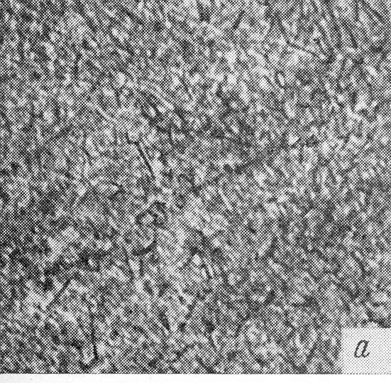 В процессе старения метастабильные - b и a¢¢–фазы при температуре 350°С начинают распадаться. При этом происходит выделение дисперсных частиц, ответственных за упрочнение сплава. При закалке сплава в воде с температур ниже 780-800°С образуется метастабильная b-фаза, распад которой при старении вызывает упрочнение сплава. При закалке с температур выше 830-850°С в структуре сплава образуется мартенситная a¢¢-фаза, при распаде которой также образуются дисперсные a- и b-фазы, упрочняющие сплав. В сплаве, закаленном с промежуточных температур, в структуре присутствуют одновременно метастабильные b- и a¢¢-фазы и упрочнение в данном случае будет определяться распадом обеих фаз. Под электронным микроскопом в сплаве ВТ16, как и в других титановых сплавах мартенситного типа, можно довольно четко наблюдать процесс распада метастабильных фаз (рис. 13) [13].