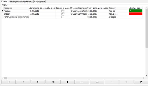 Рис Рассмотрим окно «Курсы». В окне «Курсы» имеются сведения,такие как: «Название», «Дата постановки на обучение», «Сдано/Не сдано», наличие «Итогового Протокола», «Фактическая дата сдачи», «Эксперт», «Дней до сдачи». (Рисунок ….) рис Рассмотрим окно «Версии курсов, в том числе с учетом исправлений». В данном окне, содержится все информация о конкретном курсе и его версиях, которое мы выбрали в окне «Курсы», такие как: «Название версии», «Путь загрузки», «MD5», «Дата загрузки»