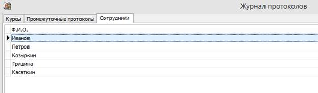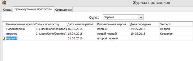 Рис 3. На вкладке «Промежуточные протоколы», с помощью фильтра по курсу, можно просмотреть все промежуточные протоколы, курса который интересует. Имеются так же сведения: «Наименование протокола», «Путь к протоколу», «Дата начала работ», «Исправленная версия», «Дата передачи», «Эксперт». Рис 4. На кладке «Сотрудники»,можно увидеть всех сотрудников, ответственных за курсы и промежуточные протоколы.