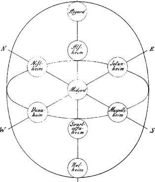 ДЕВЯТЬ МИРОВ МИСТЕРИЙ ОДИНА Нордические мистерии проводились в девяти залах, или пещерах, которые нужно было проходить последовательно. Эти залы инициации представляли собой девять сфер, на которые Дроттары подразделяли вселенную: I. Асгард – небесный мир богов; 2. Альвхейм – мир света и прекрасных эльфов, или духов; 3. Нифльхейм – мир холода и тьмы, расположенный на севере; 4. Йотунхейм – мир гигантов, который расположен на востоке; 5. Мидгард – земной мир человеческих существ, который расположен на срединном месте: 6. Ванахсйм – мир крыльев, который расположен на западе; 7. Муспелльхейм – мир огня, расположенный на юге: 8. Свартальвхейм – мир темных и предательских эльфов, который находится под землей; 9. Хельхейм – мир холода и смерти, который расположен в наинизшей точке вселенной. Следует понимать, что все эти миры недоступны чувствам человека, за исключением мира Мидгард, дома человеческих существ, но в процессе инициации душа кандидата, освобожденная от земной оболочки тайными усилиями жрецов, скитается среди обитателей этих различных сфер. Несомненно, есть параллели между девятью мирами скандинавов и девятью сферами, или планами, через которые проходили инициированные в Элевсинские мистерии в процессе возрождения. После нескольких часов блужданий в хитросплетениях коридоров кандидата подводили к статуе Бальдера Прекрасного, прототипа всех инициированных в мистериях. Эта фигура стояла в центре огромного зала, задрапированного занавесями. Там же было дерево с семью цветками – эмблема планет. В этой комнате, которая символизировала дом асов, или Мудрости, неофит клялся на мече. Он пил священный напиток из кубка‑черепа после успешного прохождения всех испытании, которые отвлекали его от поиска мудрости, и наконец ему позволялось проникнуть в тайну Одина – персонификацию Мудрости. Он представал перед священным кольцом ордена, делая это во имя Бальдера. Посвященный славился как вновь рожденный человек: о нем говорили, что он умер и вновь родился, не проходя ворот смерти. Бессмертное творение Р. Вагнера «Кольцо Нибелунга» основано на ритуалах мистерии культа Одина. Хотя композитор вольно обошелся с исходной историей, цикл опер «Кольца», считающийся самой большой музыкальной драмой в мире, ухватил и сохранил мощь оригинальных сказаний. Начиная с «Золота Рейна», действие продолжается в «Валькирии» и «Зигфриде», достигая кульминации в «Сумерках богов».