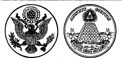 Из книги Г. Ханта «История печати Соединенных Штатов» ПРЯМАЯ И ОБРАТНАЯ СТОРОНЫ ВЕЛИКОЙ ПЕЧАТИ США Смысл мистического числа 13, которое часто появляется на великой печати Соединённых Штатов, не ограничено числом колоний, первоначально составивших США. Священная эмблема древних инициированных, составленная из 13 звезд, также появляется над головой «орла». Девиз Е Pluribus Unum содержит 13 букв, как и надпись Annuit Coeptis. Орел держит в своей правой лапе ветвь с 13 листьями и ягодами, а в левой лапе связку из 13 стрел. Фасад пирамиды, исключая панель, где написана дата, состоит из 72 камней, уложенных в 13 рядов. В своем очерке «История печати Соединенных Штатов» Гэйлард Хант непреднамеренно приводит много свидетельств, доказывающих, что эта печать имела на себе изображение феникса на лицевой стороне и Великой пирамиды в Гизе на оборотной стороне. В цветном проекте печати, сделанном в 1782 г. Уильямом Бартоном, есть феникс, сидящий в огненном гнезде. Этот факт сам по себе иллюстрирует тенденцию в использовании этой птицы в качестве эмблемы. Если кто‑нибудь сомневается в масонском и оккультном влиянии на процесс создания великой печати, ему следует ознакомиться с комментариями профессора Чарльза Эллиса Нортона из Гарвардского университета, который писал по поводу незаконченной пирамиды и Всевидящего Ока, украшающего оборотную сторону печати, следующее: «Рисунок, принятый конгрессом, практически необъясним ни при каком подходе; едва ли в нем можно видеть что‑либо иное, каким бы искусным ни был при этом сам художник, кроме безыскусной эмблемы масонского братства» (см. «Историю печати Соединенных Штатов» Г. Ханта). Орлы Наполеона и Цезаря, зодиакальный орел Скорпиона были на самом деле фениксами, потому что именно эта птица, а не орел, является символом духовной победы и достижений. Масонство сможет решить многие из своих проблем в понимании секретных эзотерических доктрин, когда поймет, что одно‑двуглавый орел есть феникс, и что для всех инициированных и философов феникс является символом превращения и возрождения творческой энергии, фигурирующей повсеместно в сочинениях как завершение великой работы. Двуглавый феникс является прототипом андрогинного человека, потому что, согласно секретным учениям, придет время, когда в человеческом теле будет два спинных столба, и в теле утвердится колебательное равновесие. Дело не только в том, что многие из основателей Соединенных Штатов были масонами; им помогали секретные и августейшие организации в Европе в установлении и устройстве этой страны со специальной целью, известной только лишь немногим избранным. Великая печать есть знак этого братства, невидимого и по большей части неизвестного. И незавершенная пирамида на оборотной стороне печати есть просто символические леса, назначение которых состоит в завершении задач, поставленных перед правительством Соединенных Штатов с самого начала его деятельности.