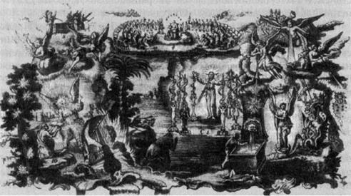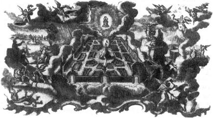 Из книги Клаубера «История Ветхого и Нового Заветов» ВИДЕНИЕ ИОАННОМ НОВОГО ИЕРУСАЛИМА В верхнем левом углу изображено разрушение Вавилона, а также ангел, который бросает мельничный жернов в море, говоря: «Насильно будет повержен город Вавилон, великий город, и не будет больше его». Ниже изображен всадник, называемый Верным и Истинным, сбрасывающий зверя в бездонную пропасть. Внизу справа ангел с ключами от бездонной пропасти, где томится тысячелетиями закованный сатана. В небесах выше находится фигура, похожая на Сына Бога, с серпом в руках, которым он жнет урожай Мира. В центре картины святой город, Новый Иерусалим, с двенадцатью воротами и горой Агнца, вздымающейся посреди города. От трона агнца льется великая река кристальной, или живой, воды, что означает духовную доктрину: тем, кто откроет и выпьет эти воды, будет даровано бессмертие. Св. Иоанн сидит и глядит на мистический город, архетип совершенной грядущей цивилизации. Над Новым Иерусалимом, в лучах славы, трон Древнейшего, который есть свет тех, кто обитает в блистательной империи духа. За пределами непосвященного мира находится сонм все более растущего числа духовно избранных. Они ходят по земле как обычные смертные, и их неутомимыми трудами царство Божие медленно, но верно воцаряется по всей земле. Эти просвещенные души являются строителями Нового Иерусалима, а их тела – живыми камнями его стен. Освещаемые факелами истины они вершат свою работу. Их трудами Золотой век вернется на землю, и власть греха и смерти будет уничтожена. По этой причине мудрецы говорят, что добродетельные и просвещенные люди, вместо того чтобы восходить на небо, сходят с небес и устраиваются на земле.