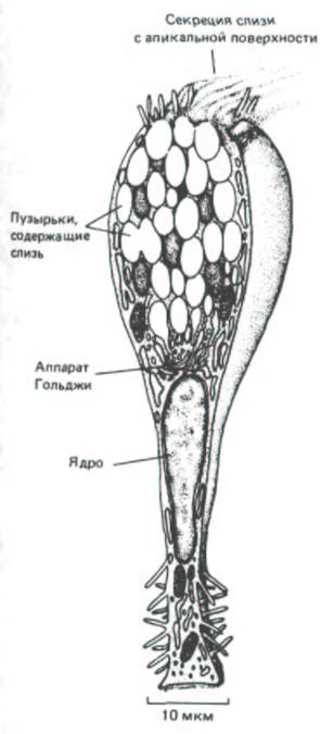Рис. 8-60. Бокаловидная клетка тонкого кишечника. Эта клетка специализирована для секреции слизи, представляющей собой смесь гликопротеинов и протеогликанов, синтезированных в ЭР и аппарате Гольджи. Аппарат Гольджи сильно поляризован, что облегчает выделение слизи путем экзоцитоза с апикальной поверхности клетки. (По R. Krstic, Illustrated Encyclopedia of Human Histology. New York: Springer-Verlag, 1984.)