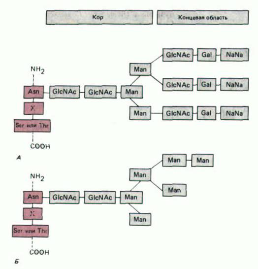 Рис. 8-61. Примеры двух основных классов связанных с аспарагином (N-связанных) олигосахаридов, обнаруженных в зрелых гликопротеинах: «сложные» олигосахариды (А) и «олигосахариды с высоким содержанием маннозы» (Б). Существует множество вариаций этих структур. Например, показанный здесь сложный олигосахарид имеет три концевых цепи, но часто встречаются также олигосахариды с двумя или четырьмя концевыми цепями, в зависимости от гликопротеина и от клетки, в которой он образуется. Встречаются также «гибридные» олигосахариды с одной маннозной концевой цепью и одной - с GlcNAc-Gal. Три аминокислоты, выделенные цветом, представляют собой последовательность, которую узнает фермент, добавляющий к белку исходный олигосахарид. Сокращения: Asn-аспарагин; Man-манноза; GlcNAc- N-ацетилглюкозамин; NANA-N-ацетилнейраминовая кислота (сиаловая кислота); Gal -галактоза; Х-любая аминокислота.
