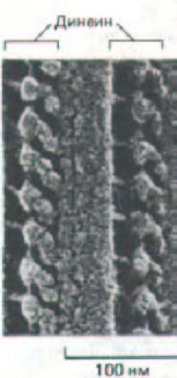 Рис. 11-56. Электронная микрофотография реснички (после замораживания-травления). Видны динеиновые ручки, отходящие от дублета микротрубочек через равные интервалы. (С любезного разрешения John Heuser.)