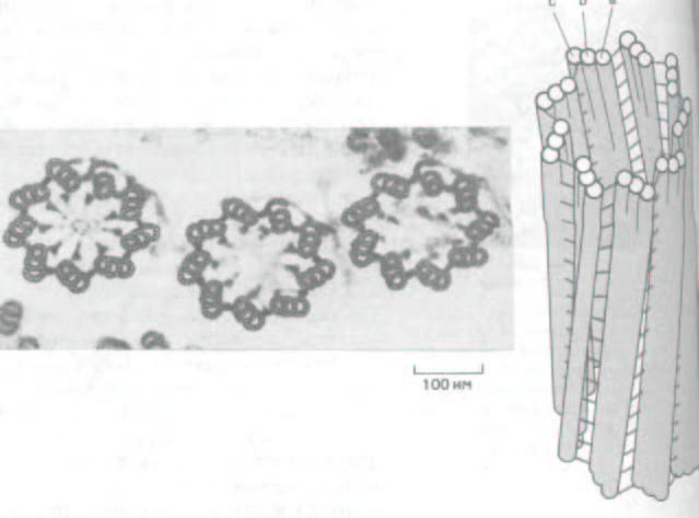 Центриоль состоит из девяти триплетов микротрубочек, причем каждый триплет (c b a) содержит одну полную микротрубочку и две примыкающие к ней неполные микротрубочки. Особые белки образуют поперечные сшивки, поддерживающие цилиндрическую структуру (выделены цветом). (С любезного разрешения D. Т. Woodrum, R. W. Linck.)