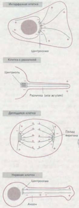 Рис. 11-66. Центриоли могут быть центрами организации для систем микротрубочек совершенно разного типа. Две центриоли в клетке слева служат базальними тельцами для аксонем ресничек, тогда как в клетке справа две центриоли образуют часть организующего центра (центросомы) для микротрубочек, радиально расходящихся по всей цитоплазме. Обратите внимание, что во втором случае микротрубочки растут не из самой центриоли, а из аморфного перицентриолярного материала.