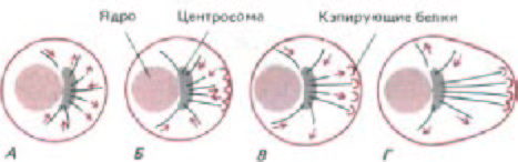 ВАЖНОСТЬ "ЗАЩИТЫ" КОНЦОВ ПОЛИМЕРА Из-за своей динамической нестабильности вновь организованная микротрубочка сможет сохраниться лишь в том случае, если оба конца защищены от деполимеризации. Минус-концы микротрубочек в клетках обычно защищены тем центром организации микротрубочек, из которого они растут, а некоторые плюс-концы, как полагают, прикрыты специальными белками, контролирующими стабильность, а тем самым и расположение микротрубочек в клетке. Так, в неполяризованной клетке (А) новые микротрубочки могут расти и укорачиваться равновероятно во всех направлениях от центросомы. Затем какая-то часть их вступает в определенном участке в контакт со структурами клеточного кортекса, которые могут кэпировать свободные плюс-концы микротрубочек (Б). Избирательная стабилизация тех микротрубочек, которые случайно столкнулись с этими кэпирующими структурами, приведет в результате к быстрому перераспределению всей массы микротрубочек и превращению клетки в полярную (В и Г).