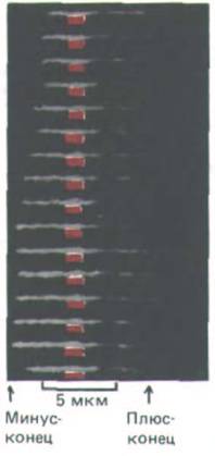 Рис. 11-64. Изменения длины одной микротрубочки, выявленные с помощью видеосъемки в темном поле микроскопа. Изображения регистрировали с интервалом 1 -2 мин и располагали в последовательном порядке на экране монитора. Два конца проходят через циклы удлинения и укорочения независимо, причем флуктуации на плюс-конце сильнее. (Т. Ног.о и Н. Hotani, Nature 321: 605-607, 1986.)