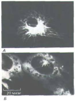 Рис. 11-65. Распределение микротрубочек в культивируемых клетках (иммунофлуоресцентные микрофотографии, окраска антителами к тубулину). А. Нормальная клетка. Б. Клетки были обработаны колцемидом в течение часа, чтобы деполимеризовать их микротрубочки, после чего им дали возможность восстановиться: микротрубочки появляются вначале как маленькие звездочки, а затем удлиняются по направлению к периферии клетки. (А-с любезного разрешения Eric Karsenti и Marc Kirschner; Б-из М. Osborn, К. Weber, Ргос. Natl. Acad. Sci. USA 73: 867-871, 1976.)
