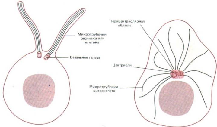 Центриоль - неизменный компонент аксонемы реснички, и в этом случае ее по традиции называют базалъным тельцем. Специальные отростки, называемые исчерченными корешками, соединяют эту центриоль с другими компонентами цитоскелета. При образовании или регенерации каждый дублет микротрубочек аксонемы берет начало от двух из трех микротрубочек триплета центриоли, так что девятилучевая симметрия центриоли сохраняется в строении аксонемы. Данные радиоавтографии указывают на то, что тубулин и другие белки аксонемы пристраиваются к дистальному концу всей структуры, т. е. к плюс-
