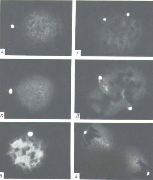Рис. 11-67. Центросоми в интерфазных и митотических животных клетках, окрашенных флуоресцентными антителами к центросомному белку. Эти микрофотографии иллюстрируют удвоение и расхождение центросом в процессе деления клетки. А и Б-интерфаза; В и Г- профаза; Д- метафаза; Е-телофа-за. Описание стадий митоза см. в разд. 13.5.1. (S. L. Brenner, B.R. Brinkley, Cold Spring Harbor Symp. Quant. Biol. 46: 241-254, 1981. С любезного разрешения Bill Brinkley.)