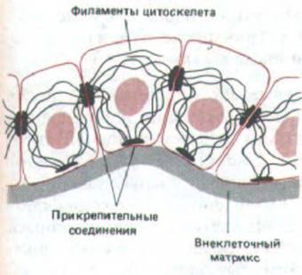 адгезионные соединения и 2) десмосомы и полудесмосомы. Адгезионные контакты служат местами соединения актиновых филаментов, а десмосомы и полудесмосомы - местами соединения промежуточных филаментов.