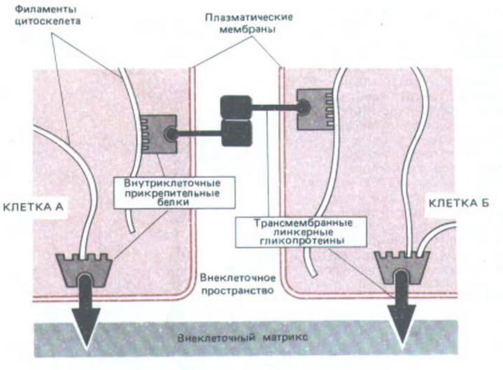 трансмембранных линкерных гликопротеинов, внутриклеточные домены которых связаны с одним или несколькими внутриклеточными прикрепительными белками, а внеклеточные домены взаимодействуют либо с внеклеточным матриксом, либо с внеклеточными доменами трансмембранных линкерных гликопротеинов другой клетки.