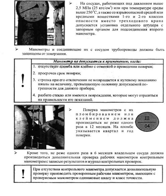 ►Манометр должен выбираться с такой шкалой, чтобы предел измерения рабочего давления находился во второй трети шкалы. ► На шкале манометра владельцем сосуда должна быть нанесена красная черта, указывающая рабочее давление в сосуде. Взамен красной черты разрешается прикреплять к корпусу манометра металлическую пластину, окрашенную в красный цвет и плотно прилегающую стеклу манометра.