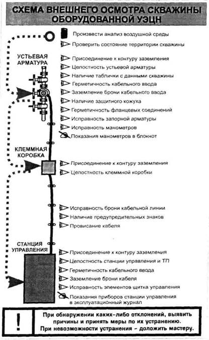Порядок проведения внешнего осмотра. Проведение внешнего осмотра наземного оборудования скважины оборудованной УЭЦН 1. Подготовительные работы. ♦ Ознакомиться с записями в вахтовом журнале. ♦ Произвести проверку средств индивидуальной зашиты на пригодность к применению, согласно инструкциям по охранетруда. ♦ Приготовить газоанализаторы для проведения анализа воздушной среды, проверив их исправность.