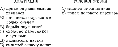 В1. Выберите процессы, изучаемые на молекулярно-генетическом уровне жизни 1) репликация ДНК 2) наследование болезни Дауна 3) ферментативные реакции 4) строение митохондрий 5) структура клеточной мембраны 6) кровообращение В2. Соотнесите характер адаптации организмов с условиями, к которым они вырабатывались