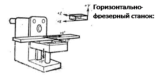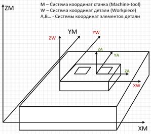 На станках с ЧПУ используют правоориентированную координатную систему, в которой предусмотрены перемещения вдоль координатных осей X,Y,Z и вращение поворотных осей А,В,С (ГОСТ 23597-79). Если станок имеет единственный шпиндель, то ось Z параллельна оси шпинделя. Положительное направление поворотных осей соответствует вращению против часовой стрелки, если смотреть со стороны положительного направления соответствующей координатной оси. Оси параллельные основным называются U, V, W. Если существуют дополнительные оси – P, Q, R.