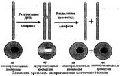 Количество генетического материала Количество генетического материала в соматической клетке зависит от периода клеточного цикла. Молодая соматическая клетка в фазе G1 и до репликации содержит 46 однохроматидных хромосом (46 молекул ДНК). В фазе S происходит полуконсервативная и асинхронная репликация ДНК, в результате чего хромосомы становятся двухроматидными (92 молекулы ДНК). Две хроматиды одной хромосомы остаются соединенными друг с другом в области центромеры до анафазы митоза, когда происходит расщепление центромеры и распределение генетического материала по дочерним клеткам. В результате, каждая дочерняя клетка получает то же количество генетической информации, что было в исходной материнской клетке (наследственная передача генетического материала от клетки к клетке).