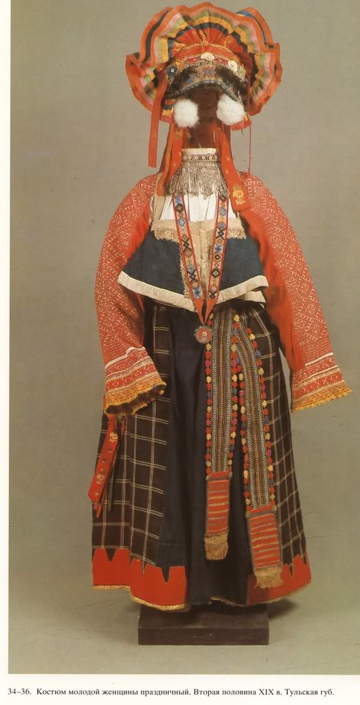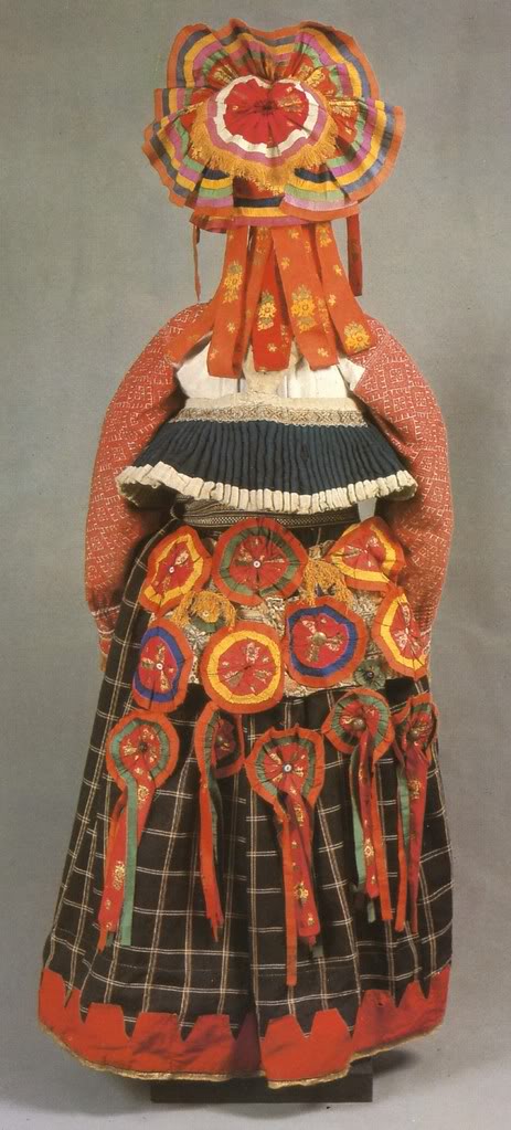 Костюм Клавдии Никодимовны: Рубаха с красными рукавами, синяя понева, синяя епанечка, тканый пояс. Головной убор - "сорока".