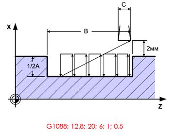 Цикл предназначен для обработки кольцевых радиальных канавок. В направлении X размеры указываются в радиальном измерении. Инструмент начинает работать от безопасной точки. G1088 128 (глубина;20; 6; 1; 0.5; 1