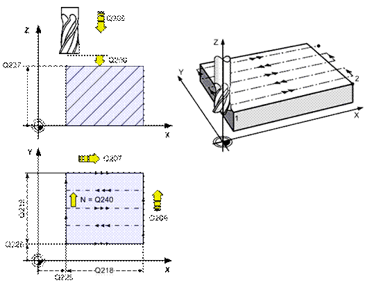 1. Инструмент ускорено перемещается в начальную точку «1», которая расположена левее заготовки на величину радиуса и выше нее. 2. Врезание в заготовку со скоростью рабочей подачи врезания. 3. Первый проход до попадания в точку «2», расстояние до этой точки подсчитывается автоматически, исходя из длины прохода и величины радиуса инструмента. 4. Инструмент переходит в начальную позицию для прохода в обратном направлении, величина врезания в поперечном направлении подсчитывается исходя из ширины рабочей плоскости и назначенного числа проходов. 5. Инструмент совершает рабочий проход в обратном направлении. 6. Фрезерование продолжается до полной обработки поверхности.