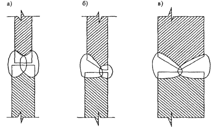 Рис. 3.2 Горизонтальные стыковые соединения стенки: а) без разделки кромок; б) с криволинейным скосом одной кромки верхнего листа; в) с двумя скосами одной кромки верхнего листа. Листы вышележащего пояса должны располагаться в пределах толщины листа нижележащего пояса. Взаимное расположение листов соседних поясов устанавливается проектом. 3.2.3. Соединения днища. 3.2.3.1. Стыковые соединения применяются при заводском изготовлении рулонируемых полотнищ днищ. Стыковые соединения на остающейся подкладке применяются для сварки кольцевых окраек, а также при полистовой сборке центральной части днищ. 3.2.3.2. Нахлесточные соединения днища применяются для соединения между собой рулонируемых полотнищ днищ, листов центральной части днищ при их полистовой сборке, а также для соединения центральной части днищ с кольцевыми окрайками (рис. 3.3, 3.4, 3.5).