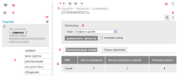 Рисунок 1 Интерфейс elearning server 1. общая навигация; 2. главное меню; 3. навигационная цепочка; 4. вкладки; 5. фильтры на странице; 6. контекстная помощь; 7. пользовательский блок; 8. рабочая область; 9. переход на другие модули системы; 10. переход на стартовую страницу; 11. список действий; 12. закрытие страницы. Навигация. Элементы общей навигации в целом повторяют функции браузера по управлению текущей страницей: