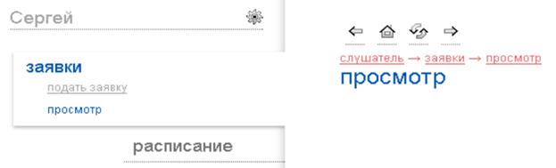 Рисунок 2 Главное меню слушателя Навигационная цепочка - элемент навигации по сайту, представляющий собой путь по сайту от его «корня» до текущей страницы, на которой находится пользователь. В системе корнем является начальная страница текущей роли. На рисунке 3 представлены 3 уровня вложенности страниц, тогда как пользователь может перейти со страницы 3-го уровня еще «глубже». В этом случае последний пункт цепочки может служить ссылкой для возврата на 3-й уровень. Например, при редактировании учебного материала, преподаватель может быстро вернуться к странице курса и библиотеке учебных материалов по ссылке в навигационной цепочке.