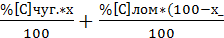[С]зав.= [С]н.п. - (0,03+0,05) - [С]ф + ∆ [С] = 0,30 - 0,3 - 0,16 + 0,4 = 0,51% Потребное количество чугуна в завалке (х) определится по уравнению: