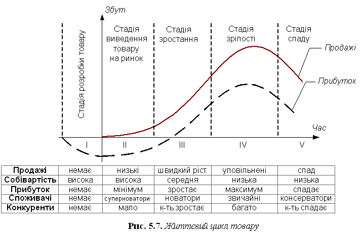1. Розробка — упродовж цього періоду підприємство розробляє і втілює в життя нову ідею. У цьому разі обсяг продажу дорівнює нулю, а обсяги інвестицій зростають разом із наближенням до завершальної стадії етапу. Виведення на ринок починається з першої появи товару на ринку. Завоювання ринку потребує часу, тому обсяг продажу зростає повільно. Прибутки на цьому етапі від'ємні або невисокі через незначний обсяг продажу чи високі витрати на реалізацію маркетингових заходів. Витрати на просування товару порівняно високі, оскільки необхідно проінформувати покупців про новий товар і надати їм можливість випробувати його. 2. Зростання. Якщо новий товар користується попитом, він переходить на етап зростання. На цьому етапі зростає обсяг продажу товару і, відповідно, розмір прибутку. Головним завданням реклами стає не ознайомлення споживачів із товаром, а переконання та підтримка прихильності до товару. У певний момент підприємство може знизити ціну, щоб залучити нових покупців. На етапі зростання виникає потреба у пошуку компромісу між великою часткою ринку та високим поточним прибутком. Витрачаючи великі кошти на вдосконалення товару, просування та розподіл, підприємство може завоювати панівне становище на ринку. У цьому разі, однак, воно відмовляється від максимального поточного прибутку, сподіваючись повернути його на наступному етапі. 3. Зрілість — зростання обсягу продажу сповільнюється, оскільки більшість потенційних покупців уже придбала товар. Рівень прибутку залишається незмінним чи знижується внаслідок збільшення витрат на заходи маркетингу, спрямовані на захист товару від конкурентів. Етап зрілості триває довше, ніж попередні етапи. Сповільнення темпів зростання обсягів продажу відбувається внаслідок появи багатьох виробників і великої кількості товару. 4. Спад — зниження обсягів продажу та скорочення прибутків. Такий стан може пояснюватися багатьма причинами: технічний прогрес, зміна смаків споживачів, посилення конкуренції тощо. Підприємства можуть припинити свою діяльність на ринку після того, як обсяги продажу та прибутку почнуть зменшуватися. Ті підприємства, що залишаються, можуть скоротити бюджет просування, знизити ціни або відмовитися від менших сегментів ринку та другорядних каналів збуту. Підтримка слабкого товару може виявитися надто дорогою. [9, 215 с.]
