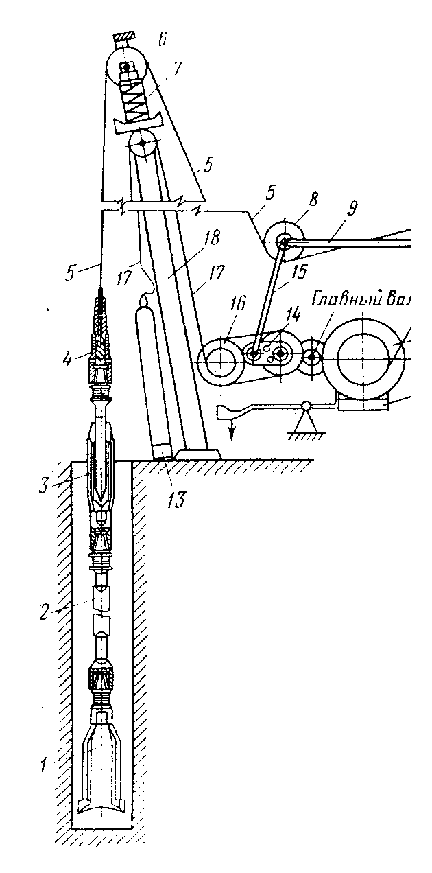 Ударное бурение. Из его всех разновидностей наибольшее распространение получило ударно-канатное бурение (рис. 8).